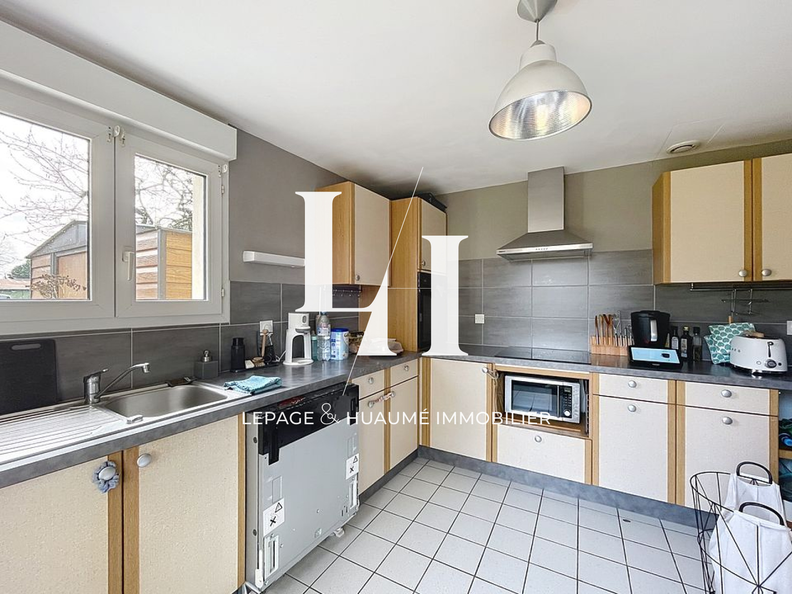 Elle offre au rez-de-chaussée : un salon lumineux, une salle à manger, une cuisine aménagée et équipée (four, plaque de cuisson et hotte) et WC.