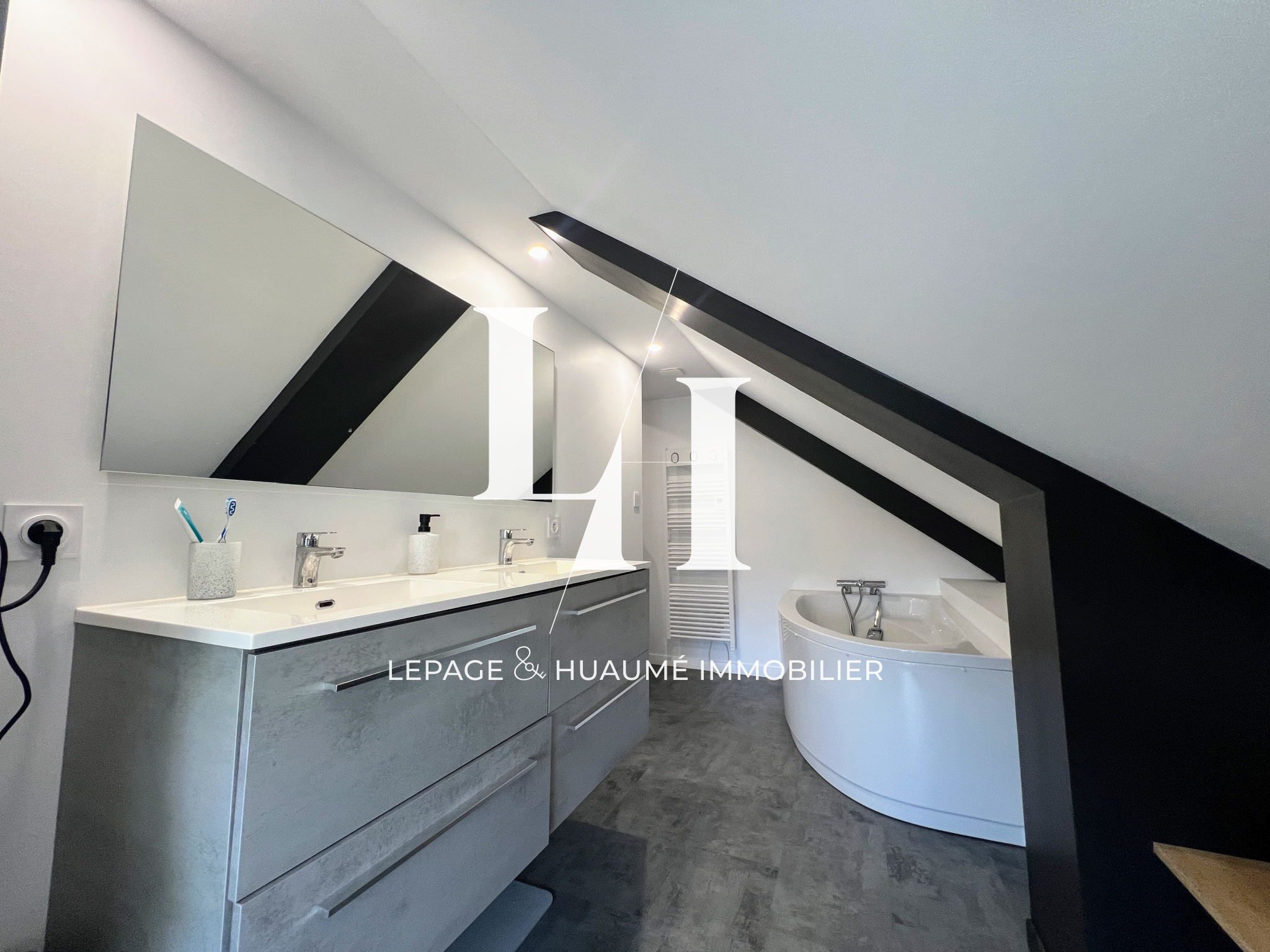 À l’étage, l’espace nuit se compose de deux belles chambres avec rangements intégrés. Vous y trouverez également une salle de bains complète aux prestations appréciables : douche, baignoire et double vasque.