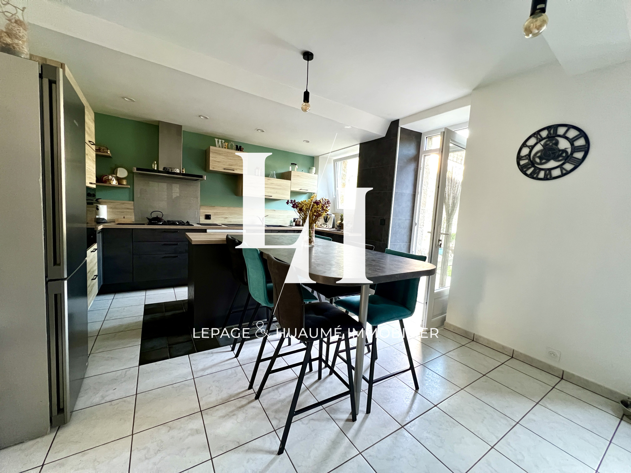 Au rez-de-chaussée, la cuisine rénovée, lumineuse et équipée, s’ouvre sur une terrasse exposée plein sud. Le salon-séjour, avec sa cheminée, invite à la convivialité.